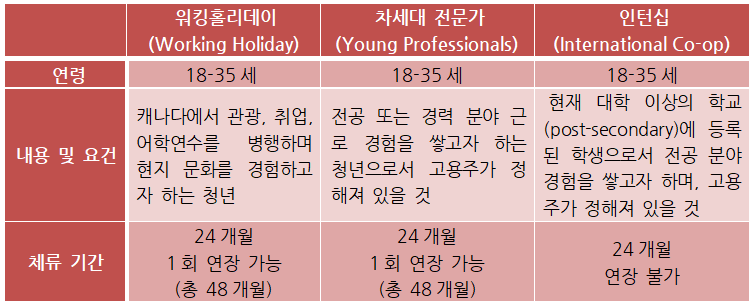 | โ ์ํนํ๋ฆฌ๋ฐ์ด(Working Holiday)์ ์ฐจ์ธ๋ ์ ๋ฌธ๊ฐ(Young Professionals) 2ํ ์ด์ฉ ๊ฐ๋ฅ โ ๋จ, ๊ฐ์ ํ๋ก๊ทธ๋จ ์์์ ์ฐ์ฅ ์ ์ฒญ โ ๊ฐ๊ฐ 2๋ ์ฉ ์ด 4๋ ์บ๋๋ค ์ฒด๋ฅ โป ๋ค๋ฅธ ํ๋ก๊ทธ๋จ์ผ๋ก ์ฐ์ฅ ์ ์ฒญ ๊ฐ๋ฅํ์ง ์์ง ๋ฐํ๋ ๋ฐ ์์ |