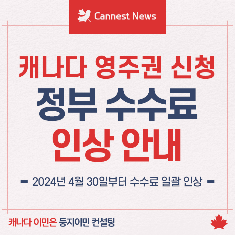 ์บ๋๋ค ์ด๋ฏผ๊ตญ ๊ท์ ์ ๋ฐ๋ผ ์์ฃผ๊ถ ์์๋ฃ๋ 2๋ ๋ง๋ค ์ธ์์ ๊ดํ ๊ณต์ง๋ฅผ ํ๊ณ ์๋๋ฐ์. ์ด์ ๋ฐ๋ผ, ์บ๋๋ค ๋๋ถ ์๊ฐ 2024๋ 4์ 30์ผ ์ค์ 9์๋ฅผ ๊ธฐ์ ์ผ๋ก ์์ฃผ๊ถ ์์๋ฃ๊ฐ ์ผ๊ด ์ธ์๋ฉ๋๋ค. (Immigration and Refugee Protection Regulations 303(1.1) ํญ ๋ฐ 294(d) ํญ)