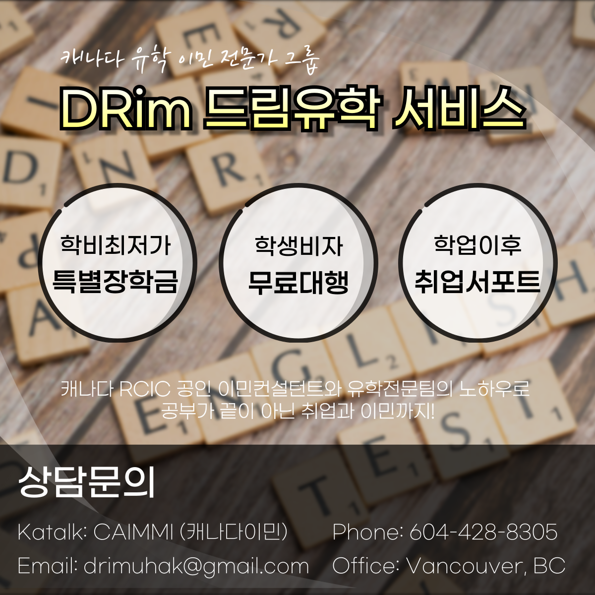 안녕하세요, 고객님의 소중한 꿈을 이뤄드리는 캐나다 현지이민법인 DRim 유학입니다.