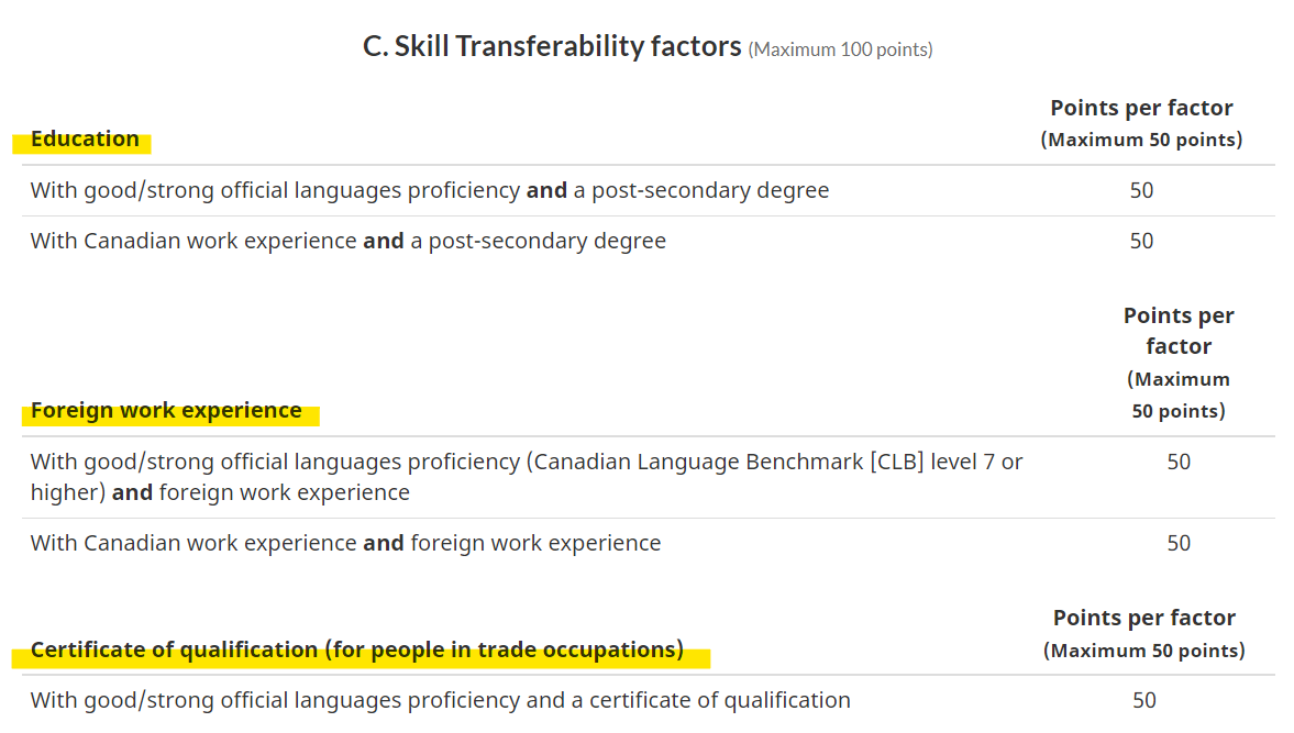 주목해야 할 점은 점수를 매기는 요소 중에 Skill Transferability Factors 항목이라고 해서 (캐나다 경력 + 해외경력, 영어점수 + 캐나다 경력, 언어 + Trade 직군 자격증 등) 콤보 점수를 얻을 수 있는 항목이 있기 때문에 항목별로 가능한 많은 점수를 받는 것이 CRS 점수를 높이는데 아주 중요하며 이를 잘 기억해 두었다가 내가 어디서 점수를 더 받을 수 있는지 미리 체크하는 것이 중요합니다.