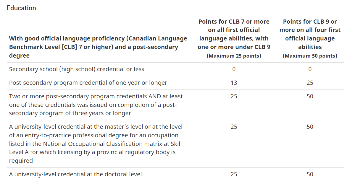 게다가(학력 + 영어) 혹은 (학력 + 캐나다 경력) 항목에서 최대 100점을 콤보 점수로 얻어 갈 수 있기 때문에 고졸이라면 아무리 영어점수에서 고득점을 받았다 하더라도 이 항목에서 콤보 점수를 얻어 갈 수 없습니다.