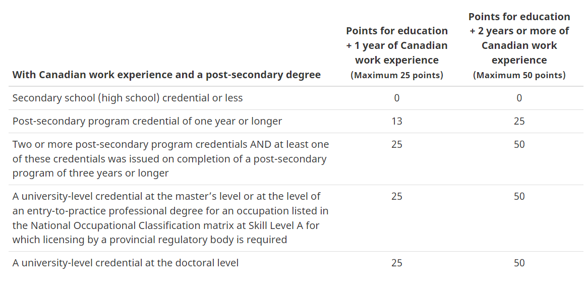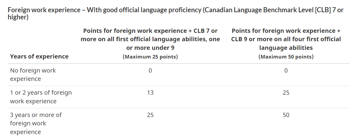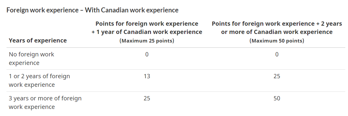 아래 표는 해외경력과 캐나다 경력이 모두 있을 경우에 추가로 받을 수 있는 점수입니다!