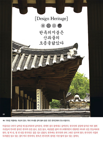 한옥의 아름다움, 선 지금 우리가 살고 있고, 앞으로도 우리가 살아가야 할 한옥에 담긴 정신이 바로 한국인의 정서로 한국인만의‘결’을 담고 있다. 바람결, 물결 하는 그 ‘결’이다. 한옥에서 아름다움을 마무리해주는 곳이 지붕이다. 지붕은 한국인의 마음의 모양을 닮고 있다. 마음의 모양은 물론 한국인이 살고 있는 상황적인 요소와 적응하기 위한 방법의 하나로, 한국인의 마음을 닮은 미학을 수용하고