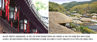 많다. 추녀마루의 추녀를 살짝 들어 올린 것은 한국건축의 멋스러움이다. 이를 앙곡昻曲이라고 한다. 살짝 들어 올린 각도가 바로 한국인의 심성으로 만들어낸 각도만큼의 들어올림이다. 앙곡의 시작점인 변곡의 위치를 잘 잡아야 넘치지도 않고, 모자라지도 않은 적정의 곡선미를 만들어낼 수 있다. 지붕이 처져 보이는 것을 방지하기 위하여 만들기도 하고, 지붕의 끝을 아름답게 마무리하기 위하여 만들기도 한다. 뿐만 아니라 일직선으로 보이는 처마선도 곡선이다. 추녀와 추녀사이에 있는 긴 처마선의 안쪽이 들어가고 추녀가 조금 튀어 나와 있는 것을 알 수 있다. 전체적으로 보면 긴 타원형의 곡선이다. 이름도 아름다운 안허리곡이라고 한다. 한옥은 지상의 양대 문화인 남방문화와 북방문화를 하나의 공간에 들여놓은 독특하면서도 아름다운 집이다. 남방문화인 마루와 북방문화인 온돌이 하나의 공간에서 만나는 집이다. 서로 다른 극단極端을 밀어내지 않고, 서로 품어 안은 화합과 조화의 집이다. 자연과의 조화를 꾀하면서도 인본을 중시한 한옥 다른 나라의 건축물은 하나의 공간을 나누어서 용도에 따라 공간배치를 한다. 하지만 한옥은 독립된 건축물을 여러 채 지어 어우러지게 하는 특성이 있다. 독립된 건축물을 짓는 대지와 산과 물과 들과 조화롭게 어울리게 짓는다. 독립적인 집 한 채가 아니라 자연과 더불어 어울리도록 하는 것에 유독 신경을 많이 쓴다. 한옥은 멀리서 보면 평면 배치를 했기 때문에 한가로워 보이고, 들어가서 보면 마당이라는 공간성을 최대한 확대해 배치했다. 실내공간과 실외공간을 절묘하게 배치한 것을 깨닫게 된다. 한옥은 여유공간을 몸소 끌어안은 건축물이다. 대문 앞에는 바깥공간의 마당이 있고, 안으로 들어가면 사랑마당, 여성들의 공간인 안채로 들어가면 안마당이 따로 만들어져 있다. 그래서 한옥은 한유閒遊(한가롭고 여유있음)와 비움의 건축물이라고 할 수 있다. 더욱 놀라운 건축이라는 것은 바로 여기에서 알 수 있다. 과학의 정신이라고 할 수 있는 설계도보다 인간을 중심에 놓는 인본人本을 우위에 두었음을 알게 된다. 세계 어느 건축사에서도 없는 방법이다. 과학이라는 잣대로 세상을 받아들이고 이해하는 건축술은 서양에서 더욱 발달했다. 모든 것을 숫자와 물리적인 원리에 의하여 이해하려 하고 또한 실행한다. 도면을 그리고 도면대로 실행하는 것이 건축술이다. 하지만 한옥은 다르다. 도면에 있는 대로 실행한 것이 눈의 착시현상에 의해 기울어져 보이면 그것을 보정한다. 도면에서 명시된 숫자에 의해 시공했을 경우, 건축물의 뒤에 다른 큰건축물이 있거나 산이나 언덕이 비대칭으로 있을 경우 건축물이 기울어 보인다. 눈의 착시현상에 의해서다. 과학의 토대 위에 있는 서양건축술과 일반적인 다른 나라의 경우는 도면과 숫자에 의한 것을 우선해서 그대로 마무리 짓는다. 하지만 한옥은 다르다. 눈의 착시현상에 의해서 기울어져 보이는 것을 보정해서 바르게 보이도록 한다. 이 역할은 한옥을 짓는 책임자인 대목수가 담당한다. 대목수가 마당에 서서 건축물을 바라보고는 기울어져 보이는 건축물을 눈으로 보정한다. 용마루가 기울어져 보이는가를 판단하고 이것을 눈에 자연스럽게 보이도록 고치는 것이다. 과학 위에 인본이 실현되는 순간이다. 세상을 더욱 크게 보는 큰마음이 아니면 실행하기 어려운 부분이다. 한국의 건축술의 독특함과 특별함은 바로 인간을 우위에 놓는 것에 있다. 과학 위에 인간을 중심에 놓는 인본을 더욱 중요하게 여긴다. 집을 짓는 터를 정할 때도 마찬가지다. 집을 짓는 터 자체만을 계산하지 않고 주위에 있는 자연물, 즉 산과 들과 물이 흐르는 것을 집과 조화롭게 지으려 노력한다. 이것이 바로 풍수지리학이다. 사람을 독립적인 것으로 파악하기보다, 자연의 일부로 파악하고 자연과 사람의 조화를 중요하게 여겼다. 그것이 한국 건축의 자연을 받아들이는 마음의 품새다. 한국 건축은 한옥으로 실현되지만 그 깊이는 한국인의 가진 마음의 특성과 기질이 그대로 들어있음을 발견하게 된다. 단층으로 짓는 것을 원칙으로 하는 데는 자연과 인간의 만남을 극대화하는 방법론에서 출발한다. 그리고 자연과의 조화를 꾀하면서도 인간의 자존에 손상이 가지 않도록 배려하는 인본의 건축이 한국건축이고, 한옥이다. 글. 신광철 (한국문화콘텐츠연구소 소장) 사진. 문화재청, 아이클릭아트,