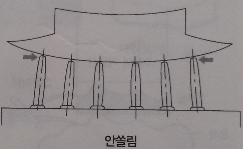 2. 안쏠림: 변두리기둥을 수직으로 세우지 않고 안쪽으로 기울어지게 세움. 건물 몸체의 윗부분이 벌어져 보이는 것 방지.