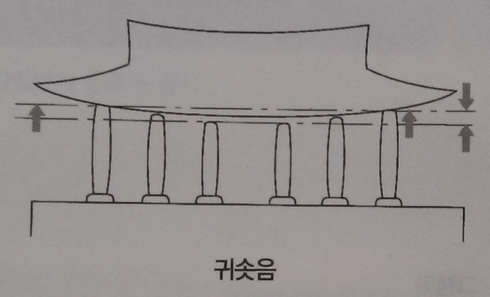 1. 귀솟음: 모서리 기둥이 가운데 기둥보다 높음, 똑같은 높이이면 건물이 양쪽에서 쳐져 보임, 실제로는 같은 높이처럼 보임