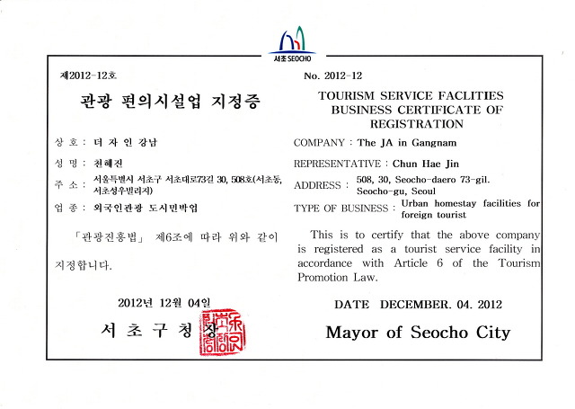 저희 게스트하우스는 2012년 12월 4일 외국인관광 도시민박업으로 정식 허가를 받고 운영이 되고 있습니다.