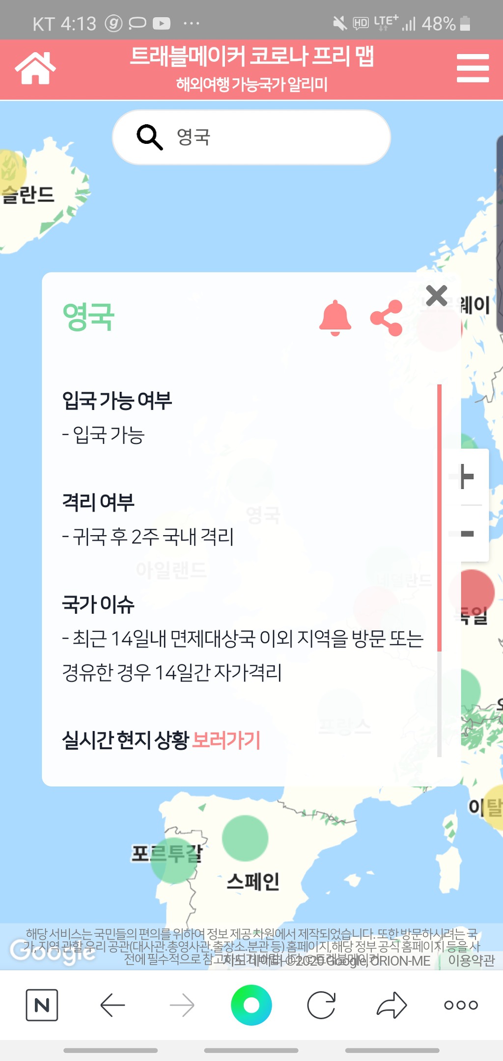 입국가능국가 싹다 알려주는 사이트 작성자나랑드싸이|작성시간20.07.30|조회수673 목록 댓글 3 글자크기 작게가 글자크기 크게가 전세계 입출국현황 알려줌. https://abit.ly/v4dtke 여기서 확인 다음검색 현재 게시글 추가 기능 열기 북마크 공유하기 신고 센터로 신고 댓글 댓글 3 댓글쓰기 답글쓰기 댓글 리스트 작성자아스따 | 작성시간 20.07.30 Thanks. I appreciate it. 작성자배한성 | 작성시간 20.08.02 4단계로 입국 구분하여 좋더군요..특히 증명서 등 있으며 격리 없는 나라들 ,좋죠..그런데 한국 입국시 격리가 어서 풀리길 바랍니다...일부 나라 상용출장의 경우 귀국시 격리 없네요...3나라 작성자장도리 | 작성시간 20.08.13 감사합니다 댓글 전체보기