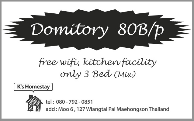 [숙박]태국 빠이(Pai) 3bed 도미토리 민박 80B/p 작성자kirk69|작성시간11.10.21|조회수478 목록 댓글 2 글자크기 작게가 글자크기 크게가 잠 만 주무실경우 80B, 부엌 사용하실경우 + 하루 20B (가스, 물, 쌀, 양념 제공)예약은 불가능합니다. 다음검색 현재 게시글 추가 기능 열기 북마크 공유하기 신고 센터로 신고 댓글 댓글 2 댓글쓰기 답글쓰기 댓글 리스트 작성자다동 | 작성시간 11.10.23 그 이름도 아름다운 Mixed Room 이군요. 한국말로 하자면 남녀혼숙방?. 올 겨울 빠이에서 며칠 보낼 예정인데 참고하겠습니다. 작성자냉정과 열정 | 작성시간 11.11.02 완전 저렴하네요. ㅎㅎ 내부만 깔끔하다면 강추할만한 위치입니다. 댓글 전체보기