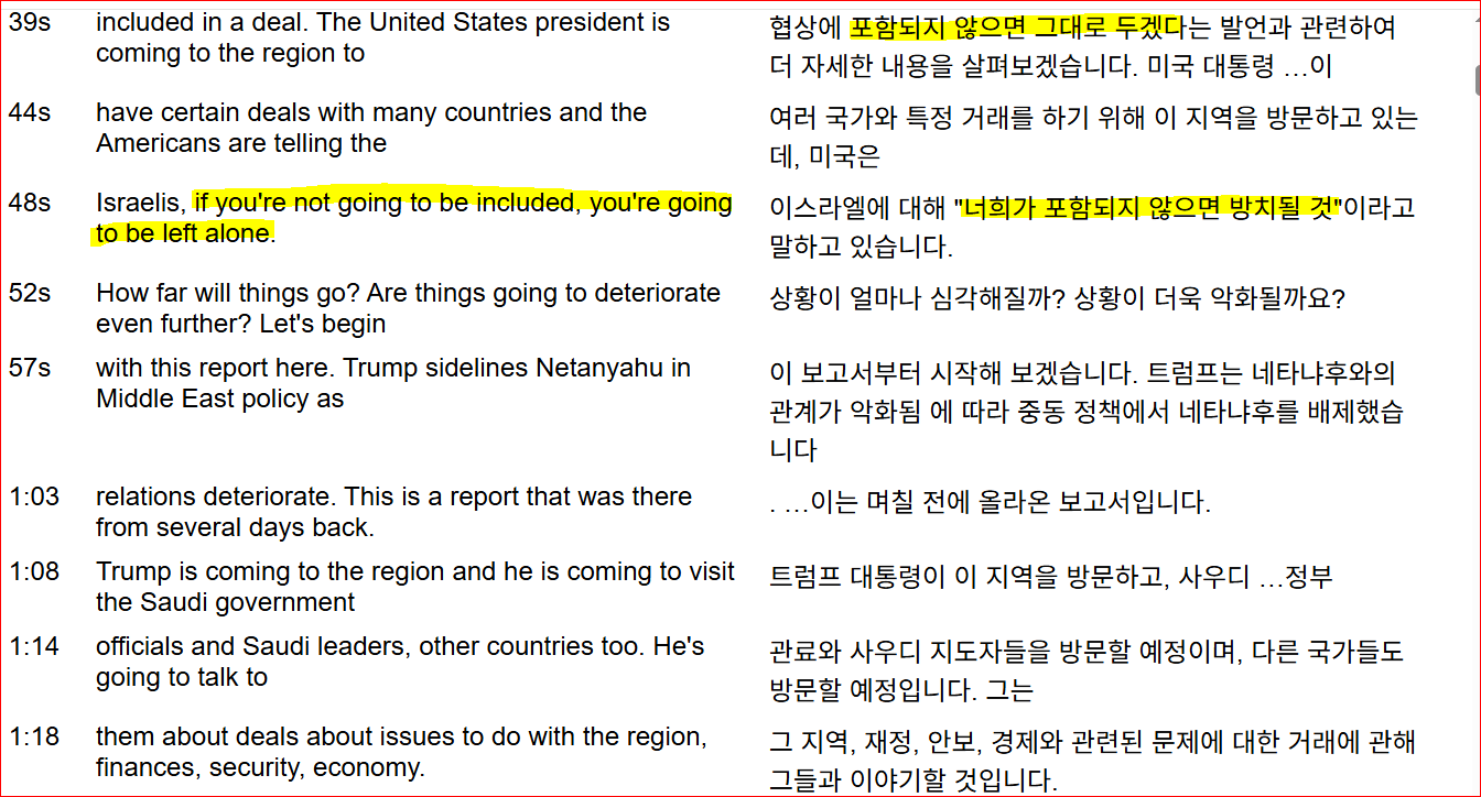 3:50 frustration and fear in Israel about Trump's zigzag policy and what lies 이스라엘 …은 트럼프의 지그재그 정책과 그 이면에 숨겨진 것에 대해 놀라울 정도로 좌절감과 두려움을 느끼고 있다고 합니다