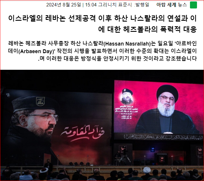 헤즈볼라는 이스라엘 11개 기지와 막사를 표적으로 삼아 공격 행진이 목표물을 향해 쉽게 통과할 수 있도록 공격 첫 번째 단계에서 320발의 미사일을 발사했다고 발표하면서 행진이 예정대로 통과했음을 강조했습니다. 나중에 헤즈볼라는 성명을 통해 이스라엘이 군사작전을 방해했다는 주장을 부인하면서 그 주장이 현장의 사실과 일치하지 않는다고 강조했습니다. 출처 : RT https://arabic.rt.com/middle_east/1594416-%D9%83%D9%84%D9%85%D8%A9-%D8%AD%D8%B3%D9%86-%D9%86%D8%B5%D8%B1-%D8%A7%D9%84%D9%84%D9%87-%D8%A8%D8%B9%D8%AF-%D9%87%D8%AC%D9%88%D9%85-%D8%A5%D8%B3%D8%B1%D8%A7%D8%A6%D9%8A%D9%84-%D8%A7%D9%84%D8%A7%D8%B3%D8%AA%D8%A8%D8%A7%D9%82%D9%8A-%D8%B6%D8%AF-%D9%84%D8%A8%D9%86%D8%A7%D9%86-%D9%88%D8%B1%D8%AF-%D8%AD%D8%B2%D8%A8-%D8%A7%D9%84%D9%84%D9%87-%D8%A7%D9%84%D8%B9%D9%86%D9%8A%D9%81-%D8%B9%D9%84%D9%8A%D9%87/ |