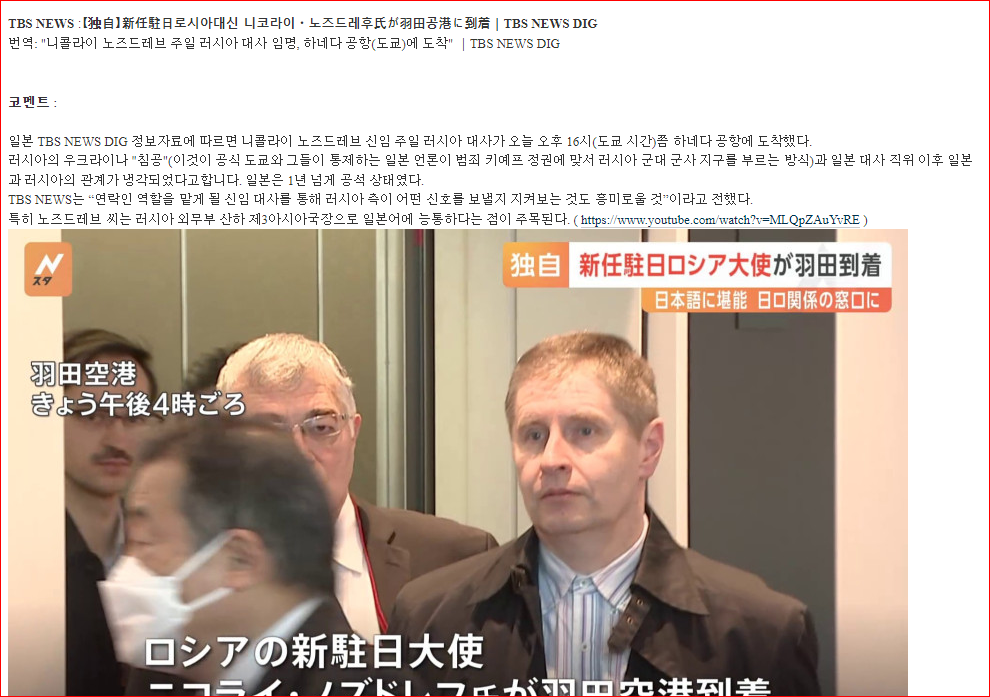 일본 TBS NEWS DIG 정보자료에 따르면 니콜라이 노즈드레브 신임 주일 러시아 대사가 오늘 오후 16시(도쿄 시간)쯤 하네다 공항에 도착했다.