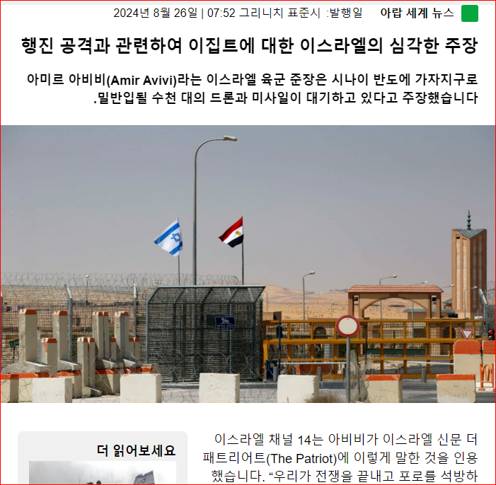 더 읽어보세요 히브리 언론, 이번주 헤즈볼라에 대한 '두 번째 선제공격' 시사이스라엘 채널 14는 아비비가 이스라엘 신문 더 패트리어트(The Patriot)에 이렇게 말한 것을 인용했습니다. “우리가 전쟁을 끝내고 포로를 석방하기 위한 협상을 논의하고 있는 지금 시나이 반도에는 수천 건의 행진과 수만 발의 미사일이 기다리고 있습니다. 스트립에 들어가서 전체 군사 균형을 바꾸십시오.” 그는 필라델피아 축이 가자와 이집트 국경에 위치하고 있으며 라파 교차점도 있다고 설명했습니다. 이 축은 하마스 운동의 "산소 파이프라인"으로 간주되며 이를 사용하여 이스라엘에 대항하는 무기를 밀수합니다. 그가 주장한 대로 군대와 심지어 이스라엘 정착민에게 발사하는 미사일까지요. 아비비는 하마스 운동에 대해 세 가지 이유를 제시했고, 거래 조건으로 이스라엘군이 필라델피아 축에서 철수해야 한다고 이집트 중재자가 주장했습니다. 그의 주장에 따르면 첫 번째 이유는 수천 명의 무장세력, 미사일, 행진이 건너편에 있다는 것입니다. 이스라엘을 공격할 기회를 기다리고 있는 국경. 그는 국경 축에서 철수를 주장하는 또 다른 이유는 일단 이스라엘군이 필라델피아를 떠나면 하마스가 납치된 사람들을 가자지구에서 시나이를 거쳐 이란으로 이송하려는 의도를 달성할 능력을 갖게 될 것이라고 덧붙였습니다. 이스라엘 장군은 텔아비브에게 "이스라엘은 필라델피아를 떠나서는 안 된다. 이집트인과 하마스는 우리가 떠나서 납치된 나머지 사람들을 가자에서 시나이로, 그리고 다시 이집트로 이송하기를 원한다"고 말했다. 이란.” 세 번째 이유는 현 협정이 발효될 경우 석방될 납치 피해자의 수가 '최대 30명'이고 이스라엘이 필라델피아 축을 포기하면 더 이상 남을 것이 없기 때문이라고 아비비는 말한다. 납치된 나머지 사람들의 석방으로 이어질 수 있는 다음 거래에서 협상을 벌이세요. 그는 만약 텔아비브가 필라델피아를 버리면 109명의 수감자들을 포함한 나머지 납치자들을 위한 협상이 불가능할 것이라고 덧붙였다. 출처: 채널 14 다음은 헤즈볼라 사무총장이 한 가장 중요한 성명입니다.