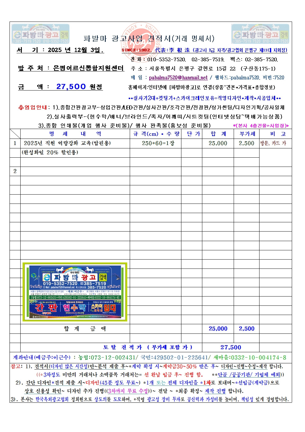 은평 어르신돌봄-(2025년 직원역량 강화교육 250*60=1/압핀--보기 작성자파발마광고(홈페이지)|작성시간25.12.02|조회수14 목록 댓글 0 글자크기 작게가 글자크기 크게가 은평 어르신돌봄--(2025년 직원역량 강화교육 250*60=1장/ 압핀용/ 완성화일--◐27,500(카드 결재가)--◐2차보기--제작 다음검색 현재 게시글 추가 기능 열기 북마크 공유하기 신고 센터로 신고 댓글 댓글 0 댓글쓰기 답글쓰기 댓글 리스트