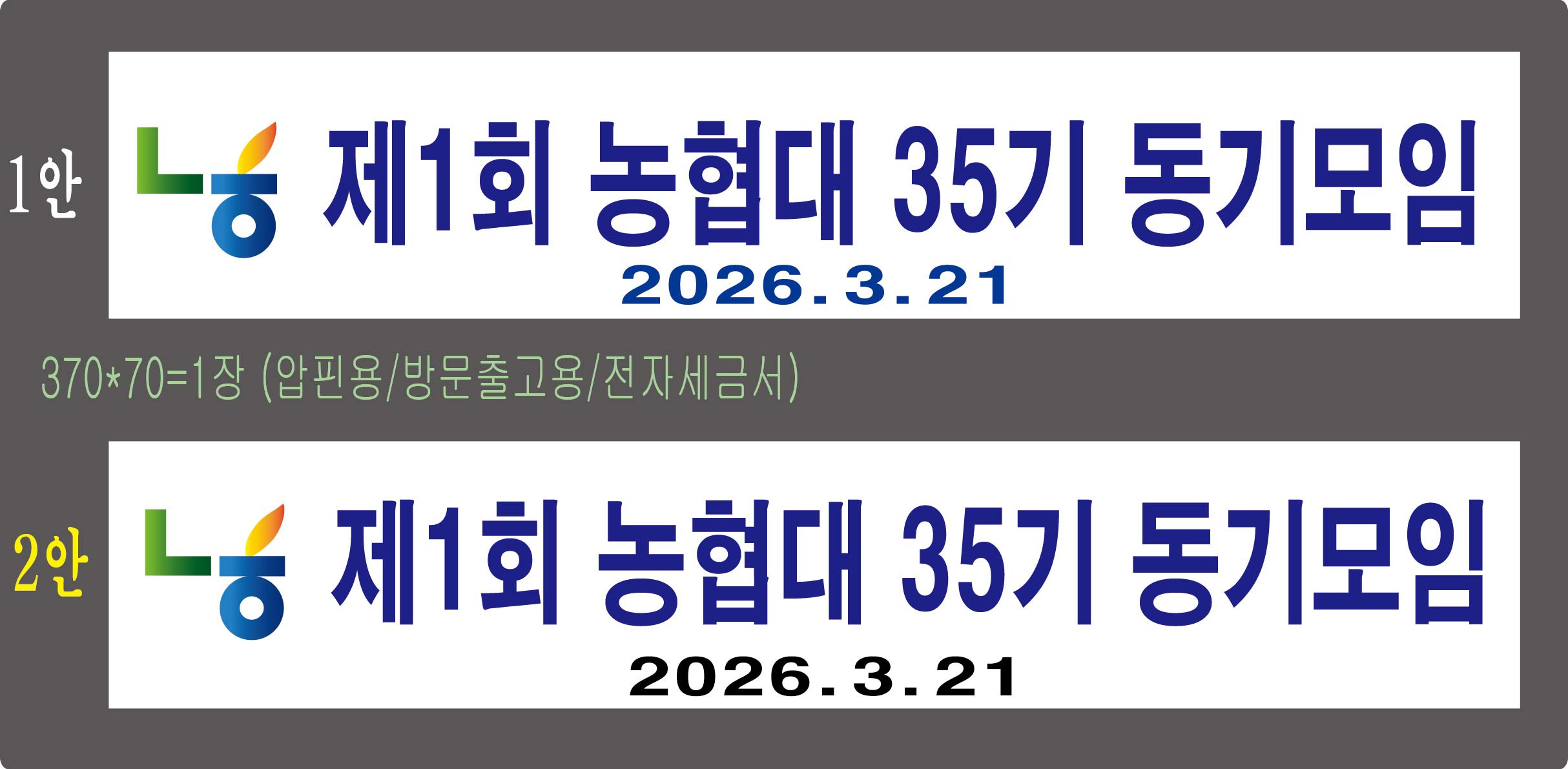 두레우가--(제1회 농협대 35기 동기모임 370*70=1장/압핀용/ ₩30,800(전자)--선택◐보기(2안 확정)--제작 함(3.17.전자발행/3.22.입금)