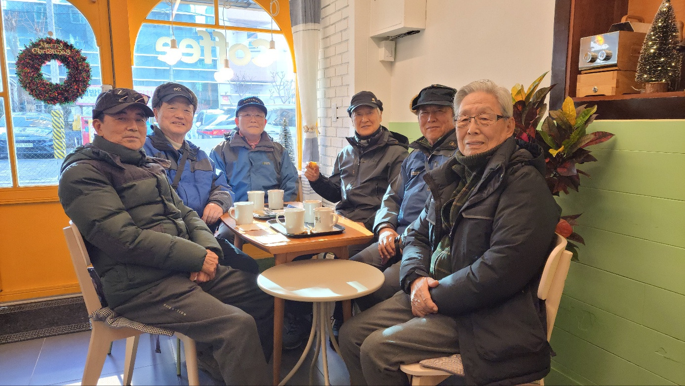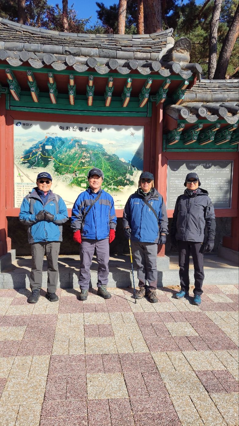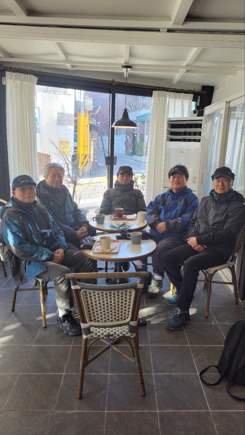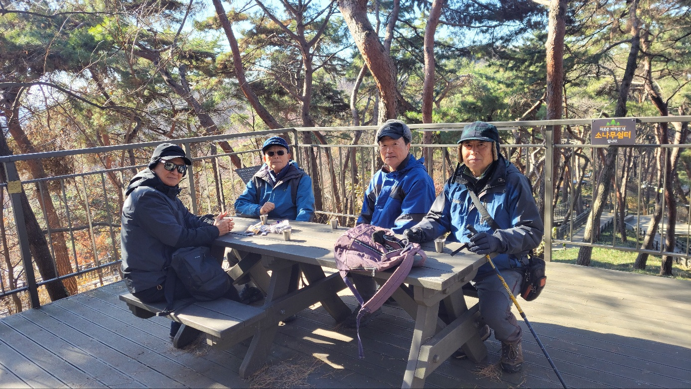 아차산 산우회는 12월 첫번째 목요일 추위에도 만나기를 즐겁게 생각하는 건강한 모임이다. 홍성열, 이해균, 김준욱, 황규명, 김영진이 나루카페에서 우선 만나 추위를 넘어 반갑게 담소를 나누며 아차산 테크를 산책하며 소나무쉼터에서 차와 간식을들며 마음도 따뜻하게 나누고, 테크길 끝까지 걸었다.내려와 박광수와 반갑게 조우, 동태탕 등으로 점심릏 먹고, 오늘 처음으로 함께한 황규명이 후원한 디져트 커피를 들고 다음을 기약하였다. 김영진의 글을 그대로 옮겼음.. 사진은 김영진이 찍었음.