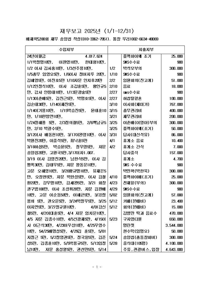 2025년도 배재80회 재무보고 작성자송양섭|작성시간25.12.31|조회수122 목록 댓글 0 글자크기 작게가 글자크기 크게가 2025년 12월 31일 배재학당80회 재무보고를 올립니다. 혹시 잘못된 곳이 있으면 연락주세요(010-3362-7951) 다음검색 현재 게시글 추가 기능 열기 북마크 공유하기 신고 센터로 신고 댓글 댓글 0 댓글쓰기 답글쓰기 댓글 리스트