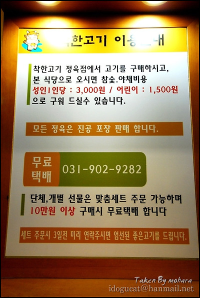 착한고기는 식당 안의 정육점에서 놀라우리만치 저렴한 가격으로 한우, 육우고기를 구매. 3천원의 야채 및 반찬 가격으로 질 좋은 숯불 위에 맘 껏 착한고기를 즐겨줄 수 있어 더 없이 매력적인 곳입니다.