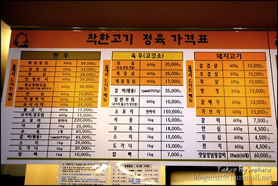 홀에서 자리를 잡은 후 이 곳에서 우선 고기를 구매 해 줍니다. 가격표의 오렌지색 안의 고기만이 홀에서 구워 드실 수 있습니다.