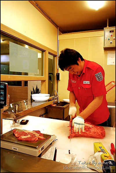 구매된 고기를 썰어 주시는 사장님과 판매하시느라 바쁘신 부사장님.