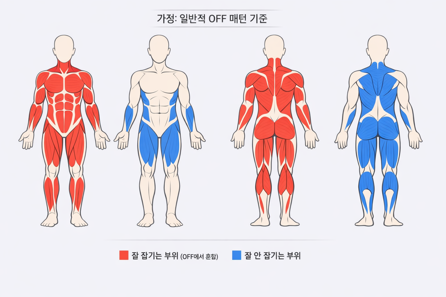 파랑(잘 안 잠기는 부위): OFF에서도 상대적으로 큰 힘·큰 관절의 단순 움직임이 남아있는 경우가 많아 “우회 회로”로 쓰기 좋은 쪽.