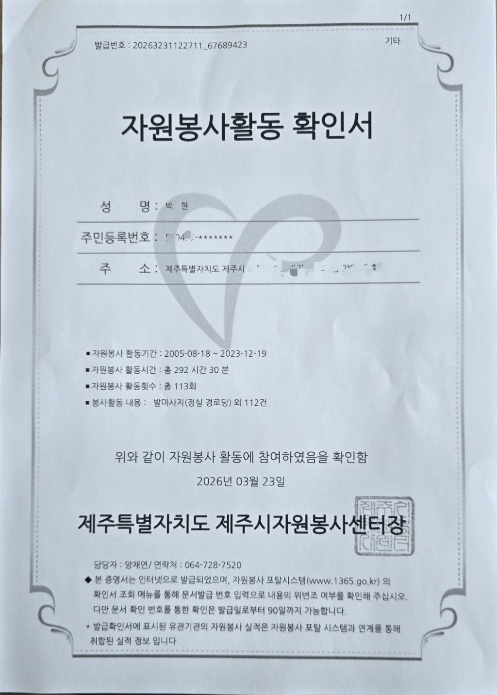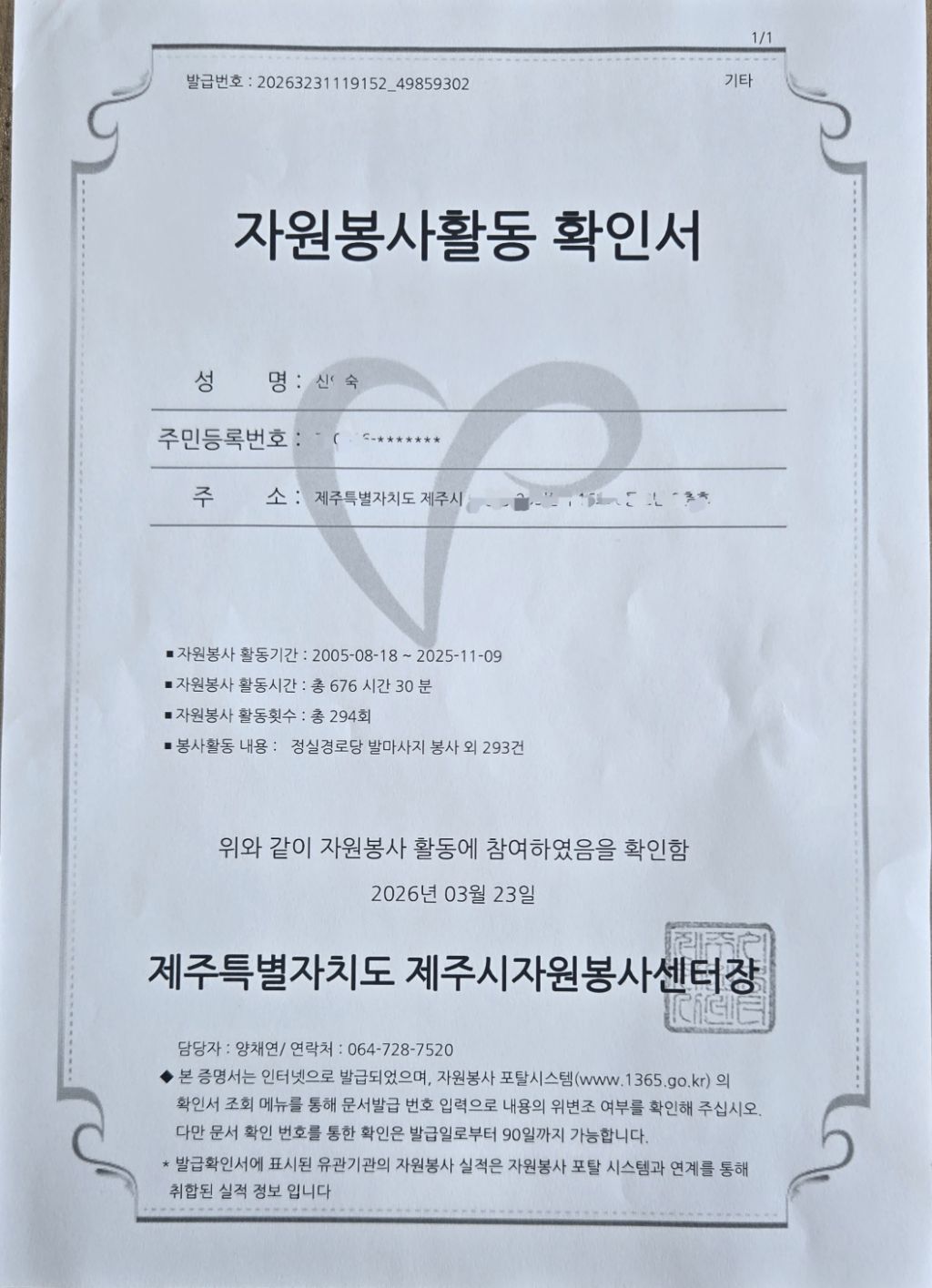 요즘은 자원봉사 등록이 개인정보로 철저해져 실명제라 제주시 자원봉사센터에 연세있으신 신입회원 모시고 등록차 갔다가 그 동안 봉사활동 시간이 궁금해져 확인서로 숫자를 보니 뿌듯해졌어요^^