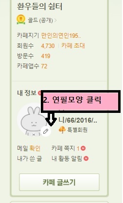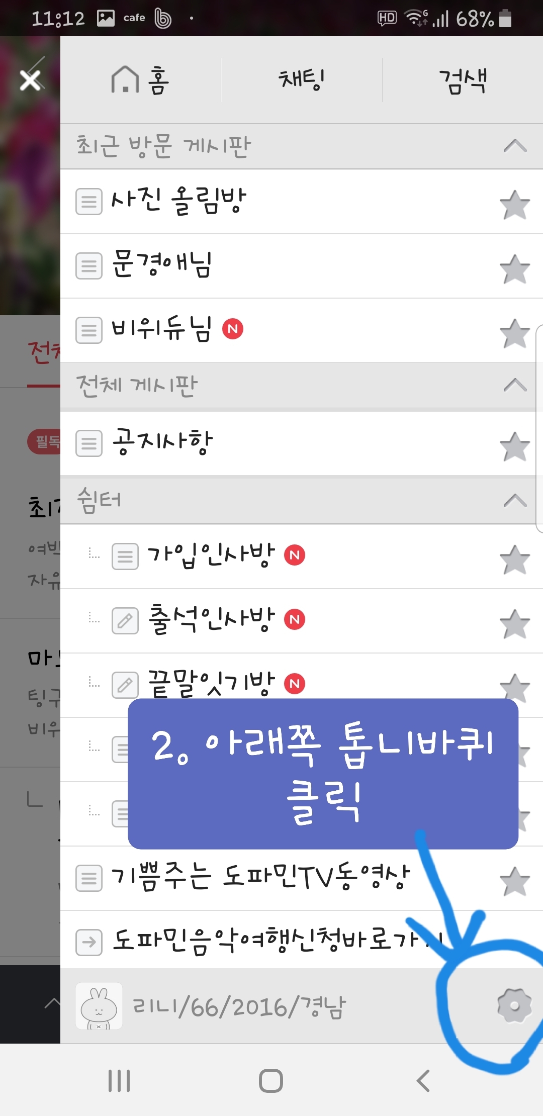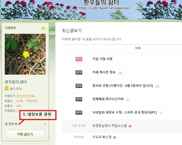 1. 카페 들어와서 맨 첫 화면의 내 정보를 클릭(살짝 터치) 합니다.