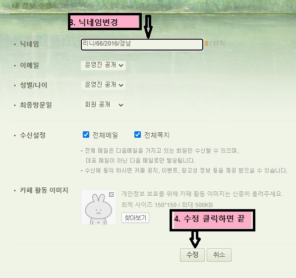 3. 새로운 닉네임을 변경할 수 있는 화면이 나타나면 닉네임칸에서 닉네임 수정하고 전체메일과 전체쪽지를 체크하신 다음 맨 아래쪽 <수정>버튼을 클릭하면 끝입니다.