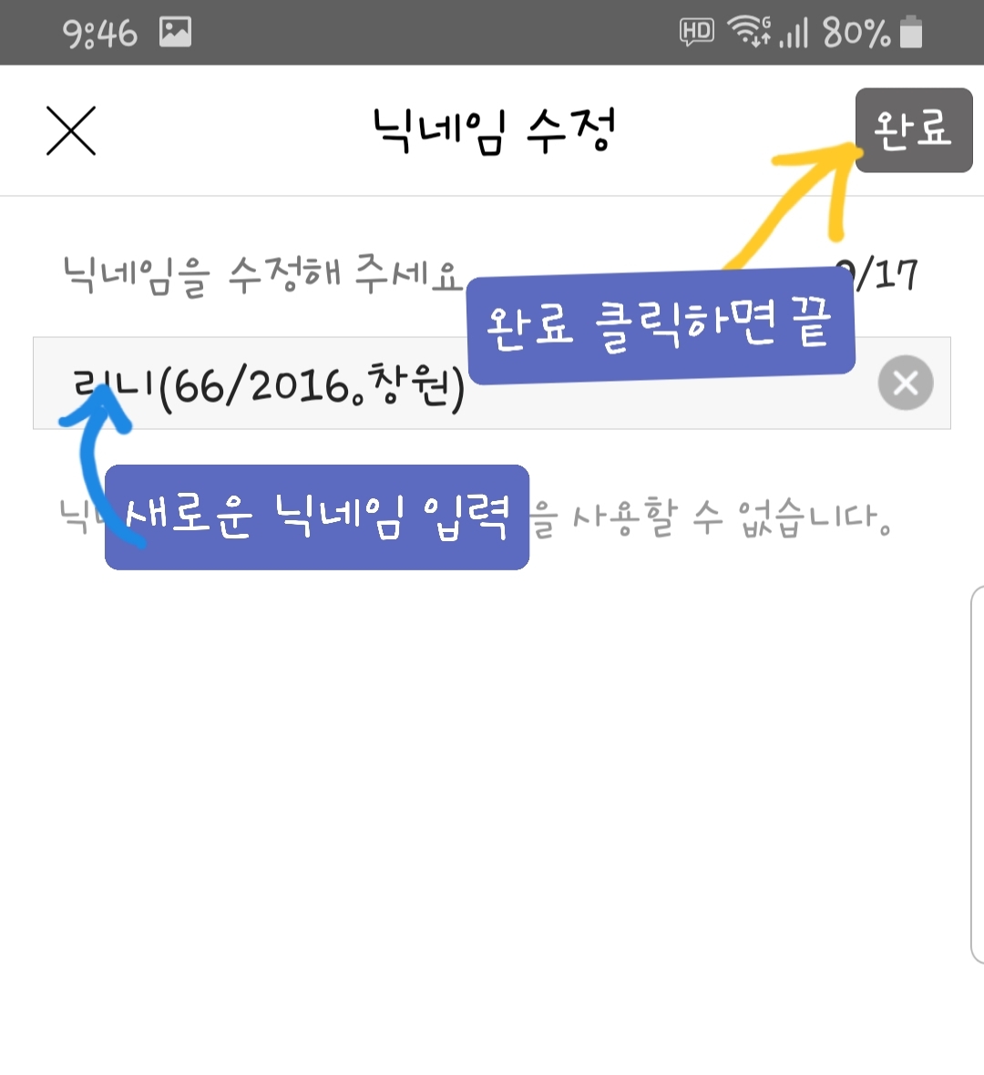 3. 닉네임수정 화면에서 새로운 닉네임 입력한 후