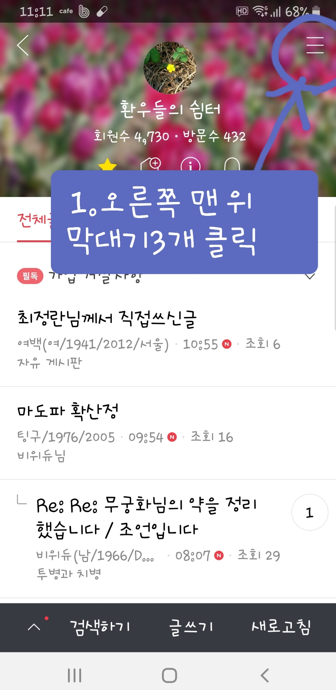 1. 첫 화면에서 맨 오른쪽 위 막대기 3개모양을 클릭합니다.