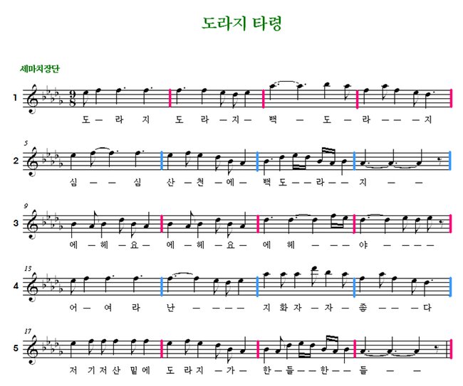 (색깔별로 3정간씩 나누어 놓은 것이 아래의 한 마디 단위이다)
