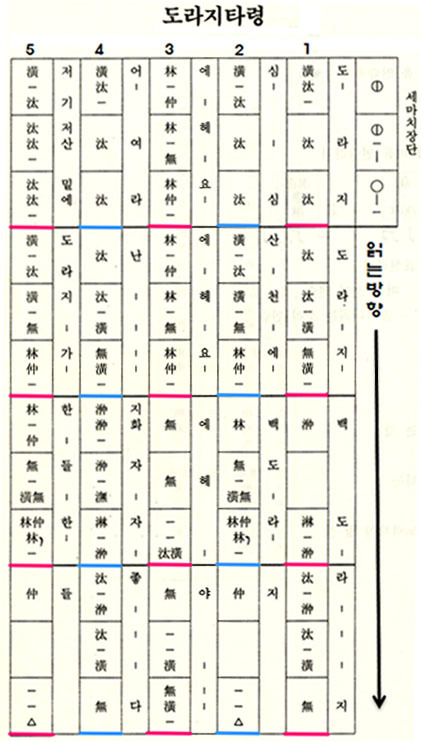 (위에서 아래로/ 오른쪽에서 왼쪽으로/ 율명은 왼쪽에서 오른쪽 순으로 읽어요)