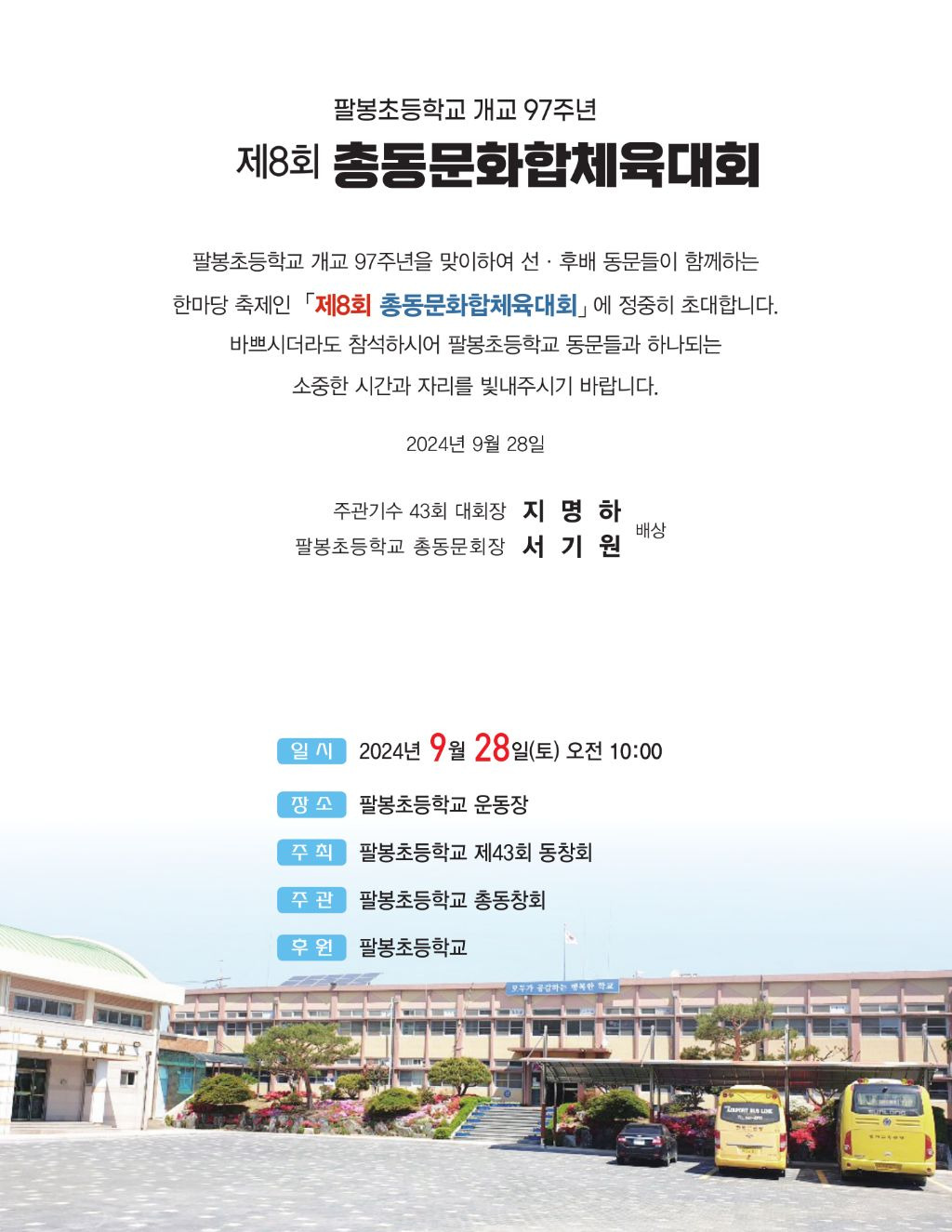제8회 총동문화합체육대회 초대장 이미지 작성자안헌엽(51회)|작성시간24.09.14|조회수227 목록 댓글 0 글자크기 작게가 글자크기 크게가 제8회 총동문화합체육대회 초대장 이미지(홍보용)입니다. 다음검색 현재 게시글 추가 기능 열기 북마크 신고 센터로 신고 댓글 댓글 0 댓글쓰기 답글쓰기 댓글 리스트
