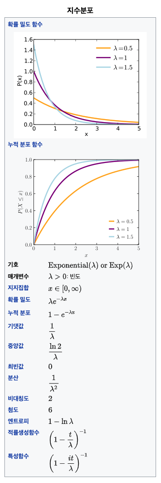 확률론과 통계학에서, 지수분포(指數分布, 영어: exponential distribution)는 연속 확률 분포의 일종이다. 사건이 서로 독립적일 때, 일정 시간동안 발생하는 사건의 횟수가 푸아송 분포를 따른다면, 다음 사건이 일어날 때까지 대기 시간은 지수분포를 따른다