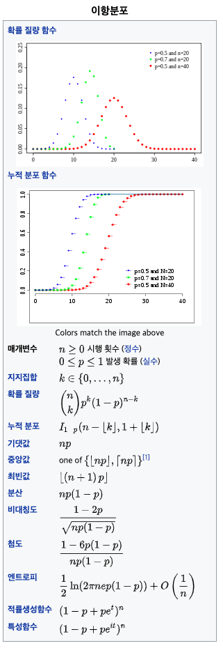 이항 분포(二項分布)는 연속된 n번의 독립적 시행에서 각 시행이 확률 p를 가질 때의 이산 확률 분포이다. 이러한 시행은 베르누이 시행이라고 불리기도 한다. 사실, n=1일 때 이항 분포는 베르누이 분포이다.