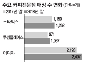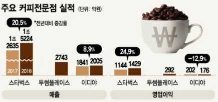 스타벅스의 매장 평균매출액은 약 12억원으로 경쟁 브랜드 '이디야 커피, 투섬플레이스'의 매장단 평균매출을 3배이상 앞선다.