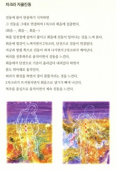 - 몸에서 진동이 제대로 일어나지 않는다면 좌뇌의 의식을 아직 놓지 못하기 때문이다. 좌뇌의 분석적인 사고를 움켜쥐고 있는 동안은 우주의 생명에너지와 분리된 상태이다. 생각을 놓았을때 몸에서 율려가 생기고 율려가 생길때 우주의 생명과 교류할 수 있다. 따라서 힐링차크라 수련은 생각을 놓는데서부터 시작된다.