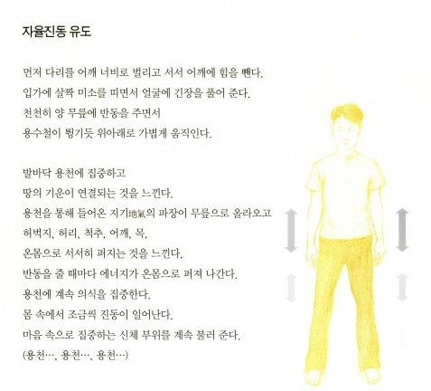 - 자율진동을 처음 시도할때는 의도적인 노력이 필요하다. 처음에는 외단전에 해당하는 용천에서부터 의식적으로 진동을 유도한다. 모든 차크라는 용천과 연결되어 있으므로 진동이 용천에서 일어나 서서히 상위차크라로 퍼져 나가게 한다. 그러다가 몸에서 자연발생적인 진동이 일어나기 시작하면 그저 그 진동에 온몸을 내맡기면 된다.