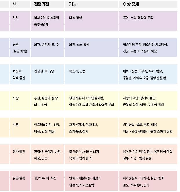 - 세상의 모든 색깔은 고유의 파장과 에너지를 가지고 있다. 차크라의 색상은 무지개의 스펙트럼처럼 서로 연결되어 섞여 있으므로 어느 한색으로 지정할 수 없다.