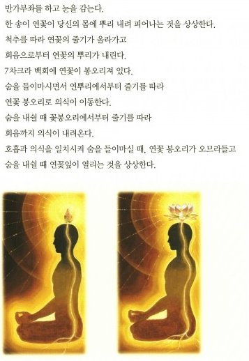 - 마침내 소리의 진동이 온 우주를 가득 메우는 것을 상상한다. 동시에 자신의 의식과 우주가 하나가 되는 것을 느낀다. 소리에 공명하여 각 차크라에서 꽃봉우리가 터지듯 연꽃이 활짝 피어난다. 조건없는 평화와 기쁨이 가슴에서 번져간다.