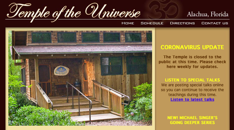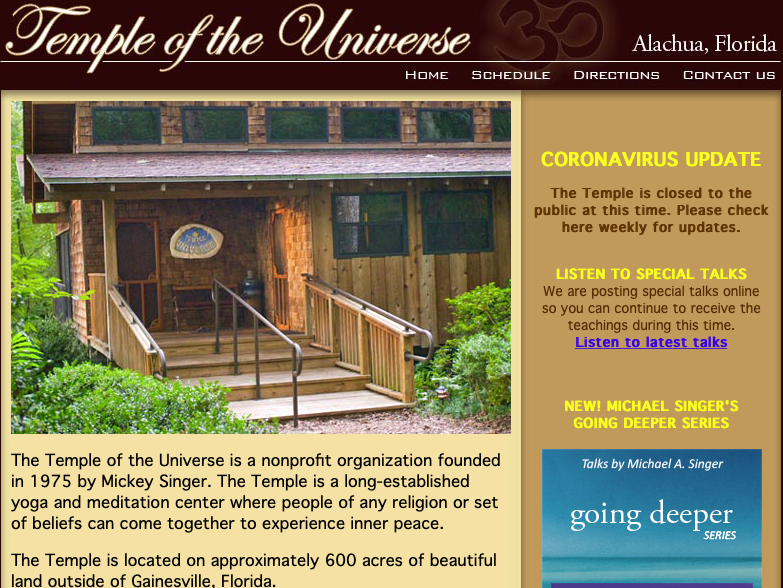 . 1975년 9월 우리는 새 사원에서 첫번째 일요 명상모임을 가졌다. 사람들은 자신에게 의미있는 종교적 물건들을 선물로 가져왔다. 한 종교학 교수는 나무로 만든 아름다운 불상을 가져왔다. 어떤 사람은 예수의 사진을 제단에 올려놓았고 나는 집으로 내려가 내가 이사오면서부터 명상하는 방에 놓아두었던 내가 제일 좋아하는 요가난다의 사진을 가지고 왔다. .. 이 사원은 모든 종교를 품는다는 의미에서도 우주적이었고 우주 자체를 품는다는 의미에서도 우주적이었다. 그렇게 사원의 이름이 지어졌다.