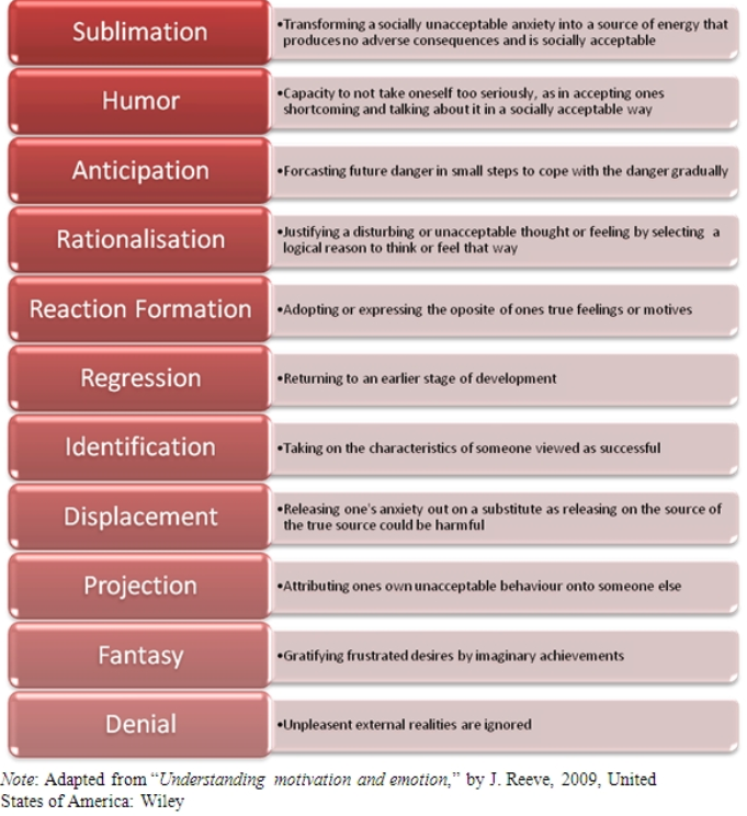 - 승화(Sublimation) : 무익한 감정이나 본능을 건강한 행동, 사고, 감정으로 고친다. 축구나 럭비 등 신체 접촉이 많은 운동을 하면서 공격성을 게임으로 돌린다.