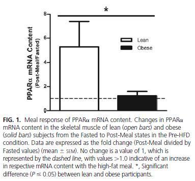 고지방 식이를 하루 한 후에 근육을 얻어 지방산의 산화와 관련된 전사인자인 PPARalpha의 발현 정도를 조사한 것입니다. Metabolic flexibility(이하 대사적 유연성이라고 하겠음)가 좋은 사람이 비만한 사람에 비해 5배 정도 PPARalpha의 발현이 증가되어 있습니다. PPARalpha는 PGC-1alpha와 더불어 지방을 분해시키는데 필요한 유전자들의 발현을 유도하는데 중요한 전사인자(master regulator)입니다. 비만한 환자의 PPARalpha발현이 감소했단 애기는 대사적 유연성이 떨어진단 애기임.