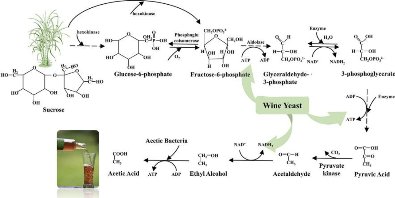 신선한 사탕수수 주스를 와인 효모와 LB 아세테이트 세균으로 발효시켜