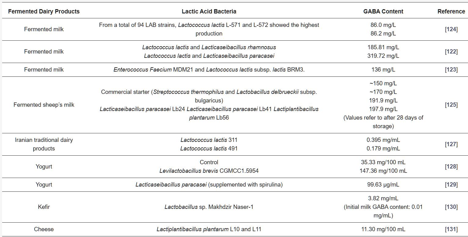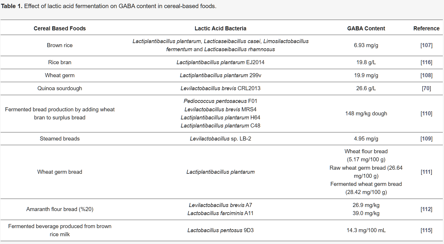 In summary, this review draws attention to the synthesis of GABA produced from LABs, the factors affecting its synthesis, and efforts to improve GABA production, underlines its areas of use in the food industry and the benefits it provides to the foods it contains. Thus, it is predicted that this review article will pave the way toward serving for future studies on increasing GABA production and developing GABA-rich functional products.