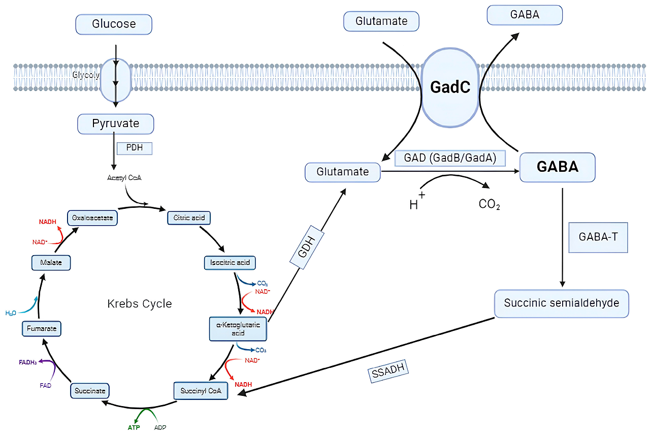글루타메이트의 α-디카르복실화 반응으로 γ-아미노 부티르산(GABA)을 생성합니다[11,12],