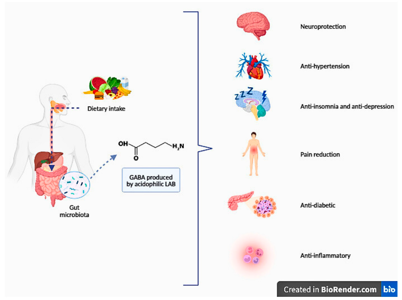 The positive effects of GABA, produced by LABs and called postbiotic, on neuroprotection, improving sleep quality, alleviating depression, and relieving pain have accelerated efforts to increase GABA production. Moreover, considering the various health benefits of GABA-enriched foods such as antidiabetics, antihypertension, and anti-inflammatory, their use will become more widespread in the coming years.