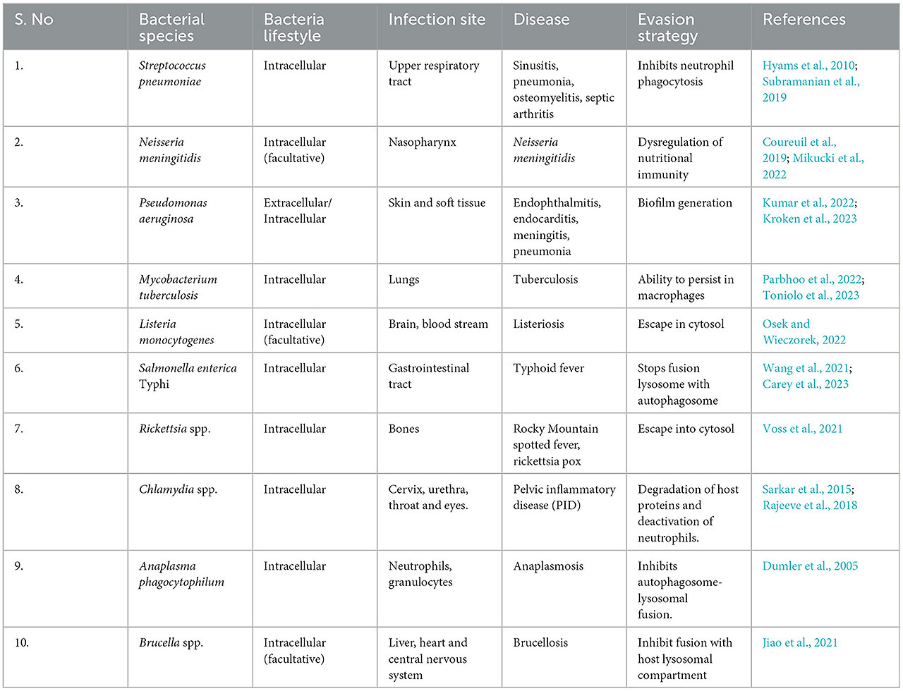 • Immune system escape—Bacteria exhibit a remarkable ability to evade immune surveillance a pivotal strategy for their survival within the host environment. This adaptive skillset plays a crucial role following their colonization of the host (Kahn et al., 2002; Finlay and McFadden, 2006). These immune evasion strategies include several sophisticated steps, including inhibiting immune-related signaling pathways, concealing within various host cells, disrupting phagosomes, deactivating reactive oxygen species, and modulating the host's immune response by altering the molecular patterns on their outer surfaces (Van Avondt et al., 2015; Rana et al., 2023). These molecular modifications serve as a camouflage, rendering these bacteria less recognizable to the host's immune receptors. By doing so, bacterial pathogens avoid detection, enabling them to persist and thrive within the host's body (Finlay and McFadden, 2006). The mastery of these intricate camouflage and precision weaponry techniques by bacterial pathogens significantly complicates the development of novel vaccines and innovative treatments. In essence, the bacterial world's ability to navigate and manipulate the host's immune defenses represents a formidable challenge, requiring ingenious approaches to counter their crafty strategies and advance medical interventions (Table 1).
