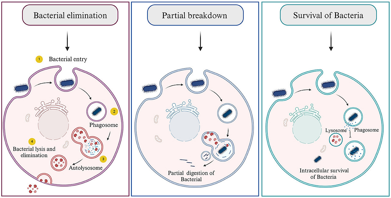 When bacteria target a host cell and choose to invade it for shelter, they employ several evasion strategies to circumvent or neutralize the host's robust immune defenses (Hornef et al., 2002) There are three possibilities arose as the host cell encounters bacteria: (1) the killing/degradation of bacteria by autophagolysosomal fusion, (2) partial digestion of bacteria where the genome of bacteria can persist inside the cell for a longer time and may or may not cause any harm, and (3) where the bacteria successfully evade and survive inside the host cells (Figure 5) (Asrat et al., 2014; Choi et al., 2018; Riebisch et al., 2021). These methods include secreting proteins that can degrade or hinder the host's immune system, modifying the surface of their own membranes, or imitating the actions of host factors. This intricate interplay allows them to establish residence within the host and ensure their safety.