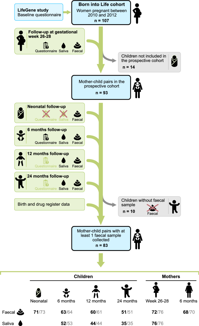 This study is based on the prospective longitudinal cohort study Born into Life15. The cohort consists of women who lived in Stockholm County, Sweden, enrolled in the LifeGene study and became pregnant at any time between 2010 and 201216. Children were delivered at the same clinic and were included in the cohort upon delivery. The cohort comprised 107 pregnant women, while the associated child cohort, with consent from the parents to follow the children also after birth, comprised 93 children (Fig. 1).
